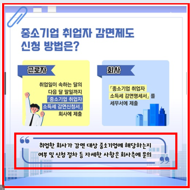 신청은 첫 연말정산 때 소득세 감면 신청서를 작성해 회사에 제출하면 회사가 세무서에 신고합니다.